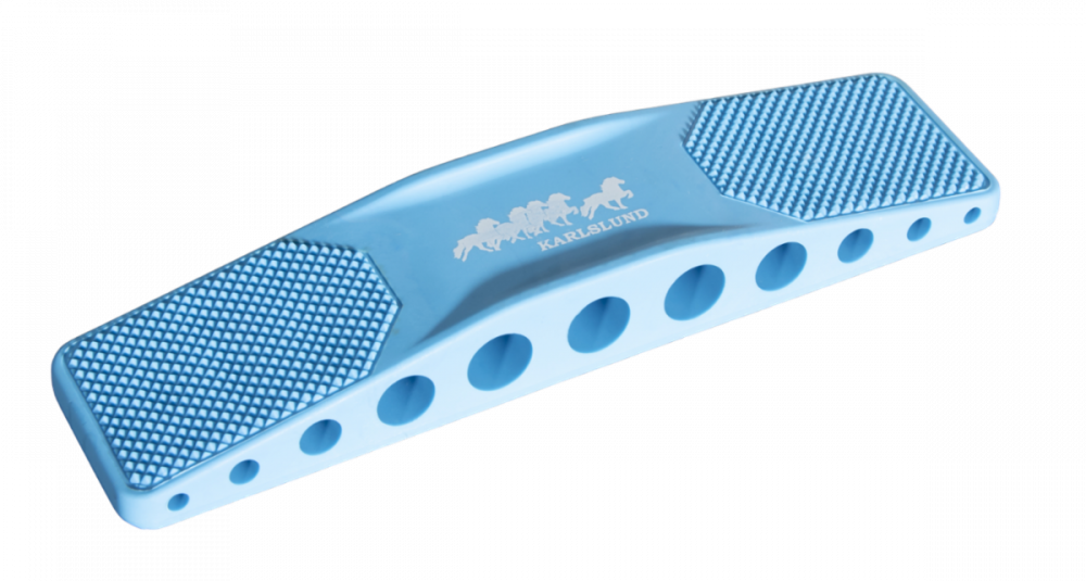 Den er udformet med små børsteflader på den ene side som passer til hestens hoved og ben, og den anden side passer til hestens krop. Den er fremstillet af blødt gummi.