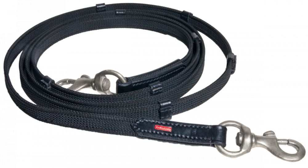 Elegant, smal tøjle i stærk kvalitet med gummi-vævning og praktiske stoppere, der sikrer et sikkert greb og hjælper dig med at holde tøjlerne i den rette længde. Tøjlen ligger godt i hånden.